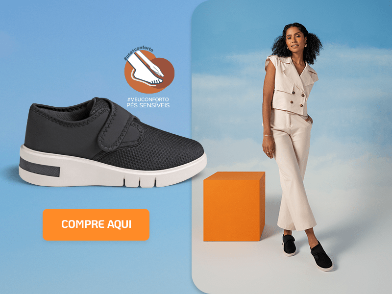 Mais uma opção monocromática, mas com o tênis fazendo as honras do look – e que também conta com a tecnologia Pés Sensíveis. Nesta opção, a versão em preto com fechamento em velcro apresenta uma leveza que combina perfeitamente com calça e colete em alfaiataria.