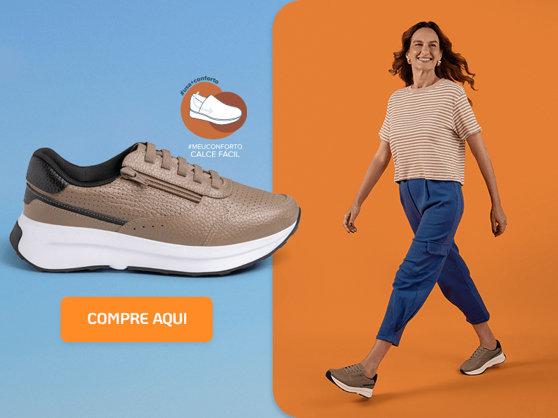 O conforto traduzido em uma imagem: calça, camiseta e um tênis que vai ser difícil você querer tirar do pé. Feito em couro marrom com detalhes em preto e solado branco, ele possui a tecnologia Calce Fácil, que se adapta ergonomicamente e reduz a pressão nos pés – e é um item essencial no seu guarda-roupas para um final de semana de descanso.