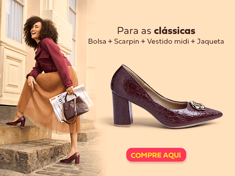 Por outro lado, se você prefere o estilo clássico, nossa dica é combinar um vestido midi de tom neutro com uma terceira peça, além de bolsa e sapatos em burgundy para complementar. Assim, o look fica estiloso sem abrir mão do amado toque tradicional. E, claro, o melhor modelo para acompanhar essa composição é o scarpin. Concorda?