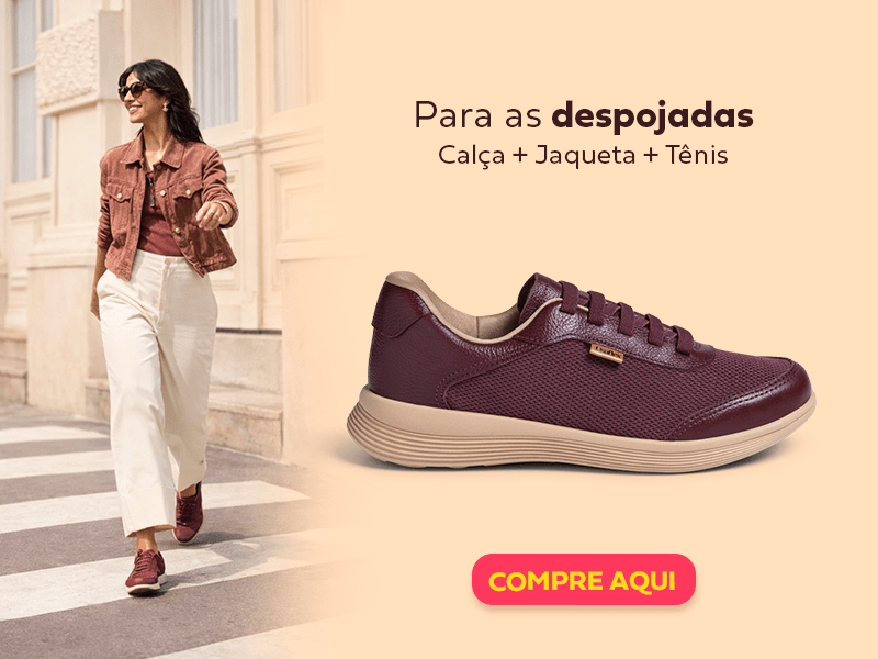 Agora, se você faz parte do time das despojadas, chegou a sua vez! Uma composição mais soltinha já faz toda a diferença: experimente uma base neutra, com calça reta clara, blusa e jaqueta marrom, e deixe a cor mais vibrante para os pés, com um tênis burgundy que acompanha você o dia todo com muito conforto.