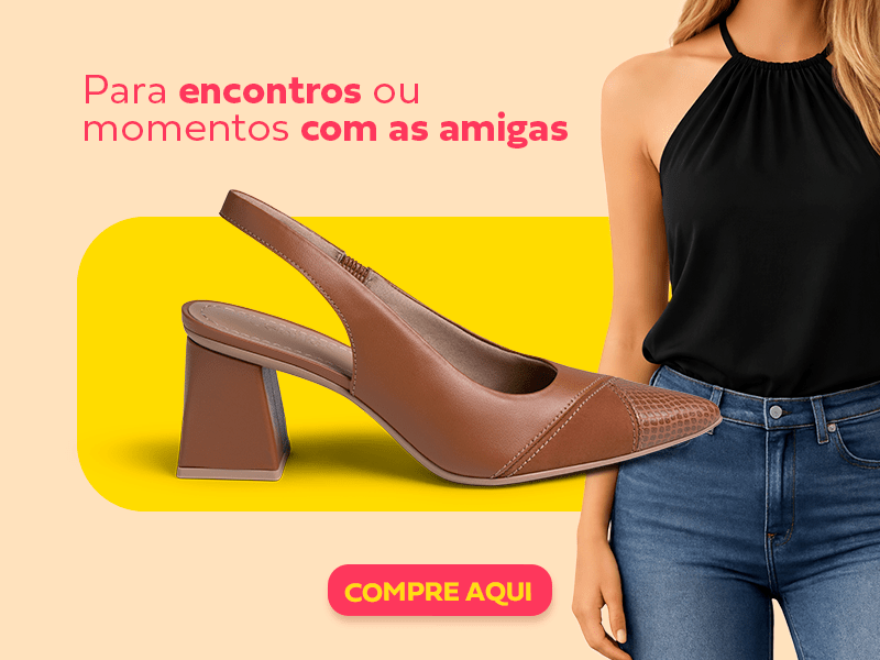 Para aqueles dias em que você vai encontrar alguém especial, a escolha perfeita é o slingback caramelo, que une o charme do patchwork à elegância do salto bloco. Para equilibrar a produção, aposte na clássica calça jeans de lavagem média com uma blusa preta de gola alta. Quer uma dica extra? Use um penteado com o cabelo preso para dar o toque final.