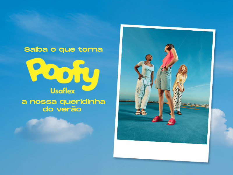 Agora a coleção Poofy também tem tênis, com design jovem e cores vibrantes, porque no verão também dá para usar sapato fechado com leveza e muito estilo. Quer uma dica? Misturar roupas mais sociais com o estilo esportivo dos tênis Poofy traz um visual descolado e moderno, ótimo para trabalhar. Essa quebra no visual é tendência e, se você experimentar, com certeza vai amar.