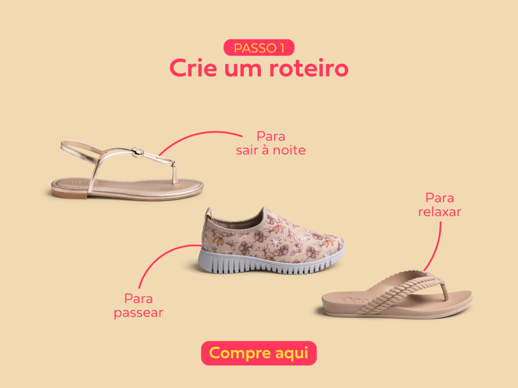 Uma dica de ouro é levar três pares de sapatos: um para os passeios, outro para as saídas e um mais confortável para relaxar. Pense no roteiro e vá separando as peças de acordo com as ocasiões.