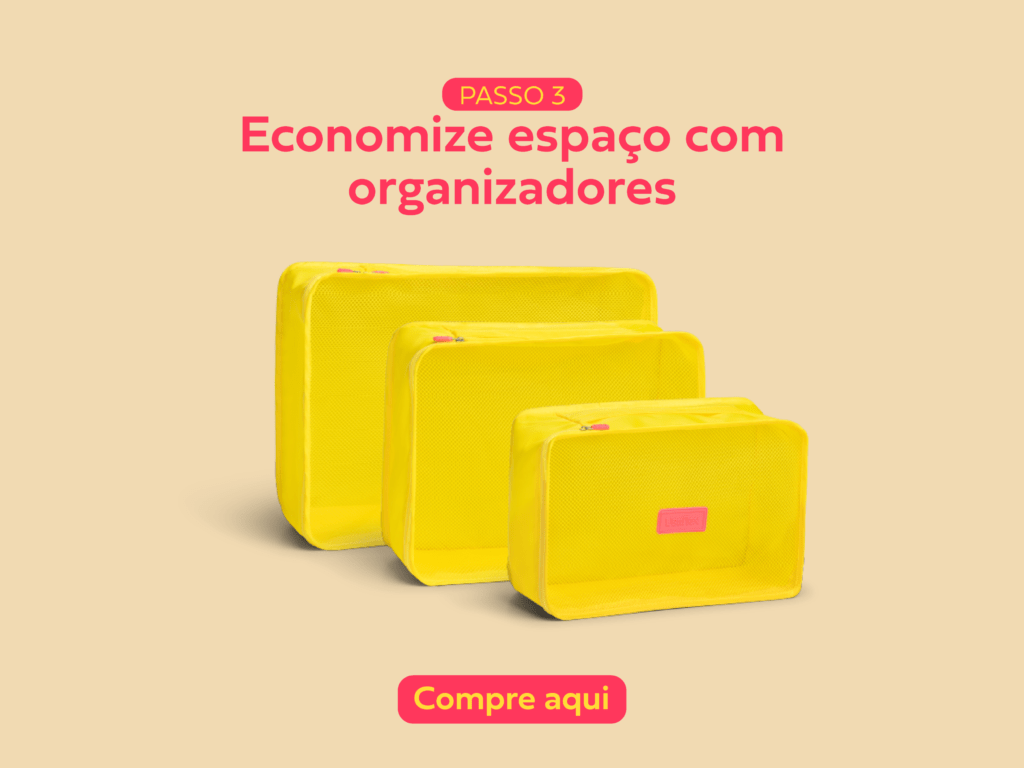 3) Use organizadores, que ajudam a separar os looks por dia e facilitam encontrar o que você precisa. Pronto, mala arrumada para começar a viagem.